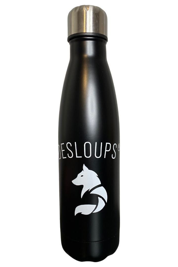 Matte black insulated bottle with white Desloups logo print.
