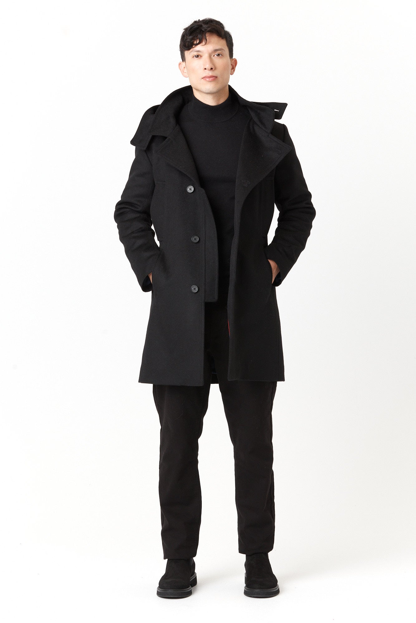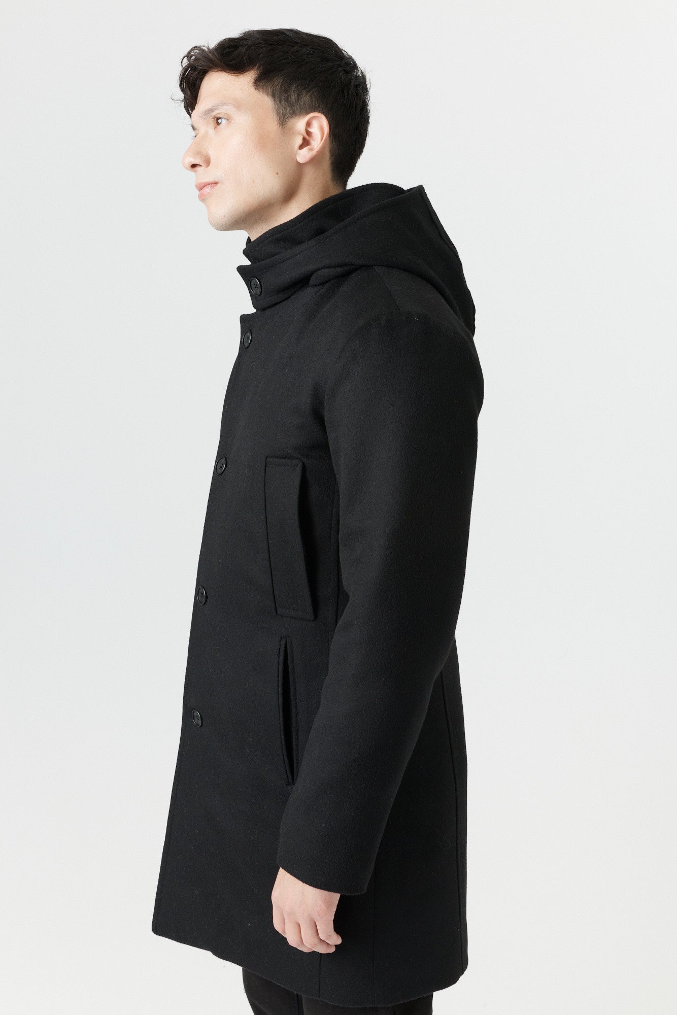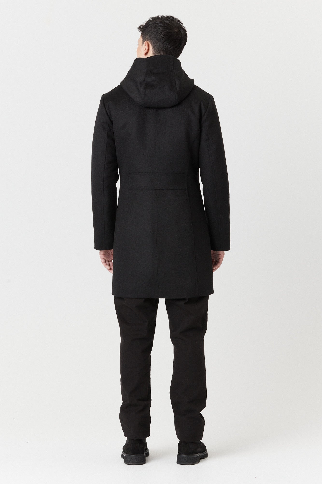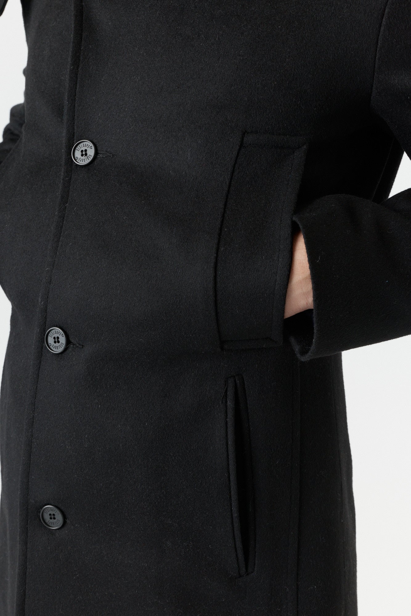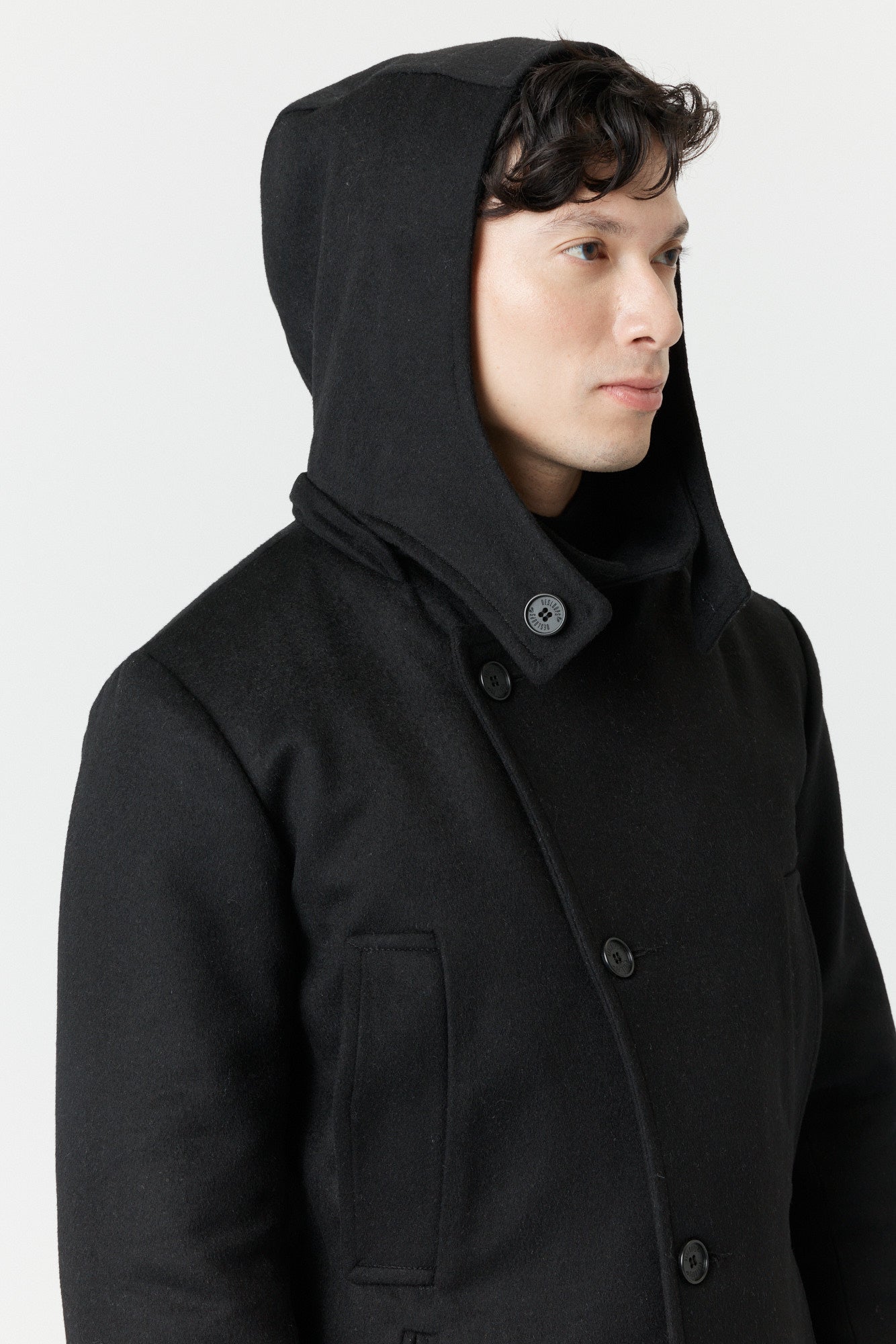 Long coat, fitted cut, urban made of virgin wool. Quilted lining, hand warmer pockets, interior pocket and detachable hood.