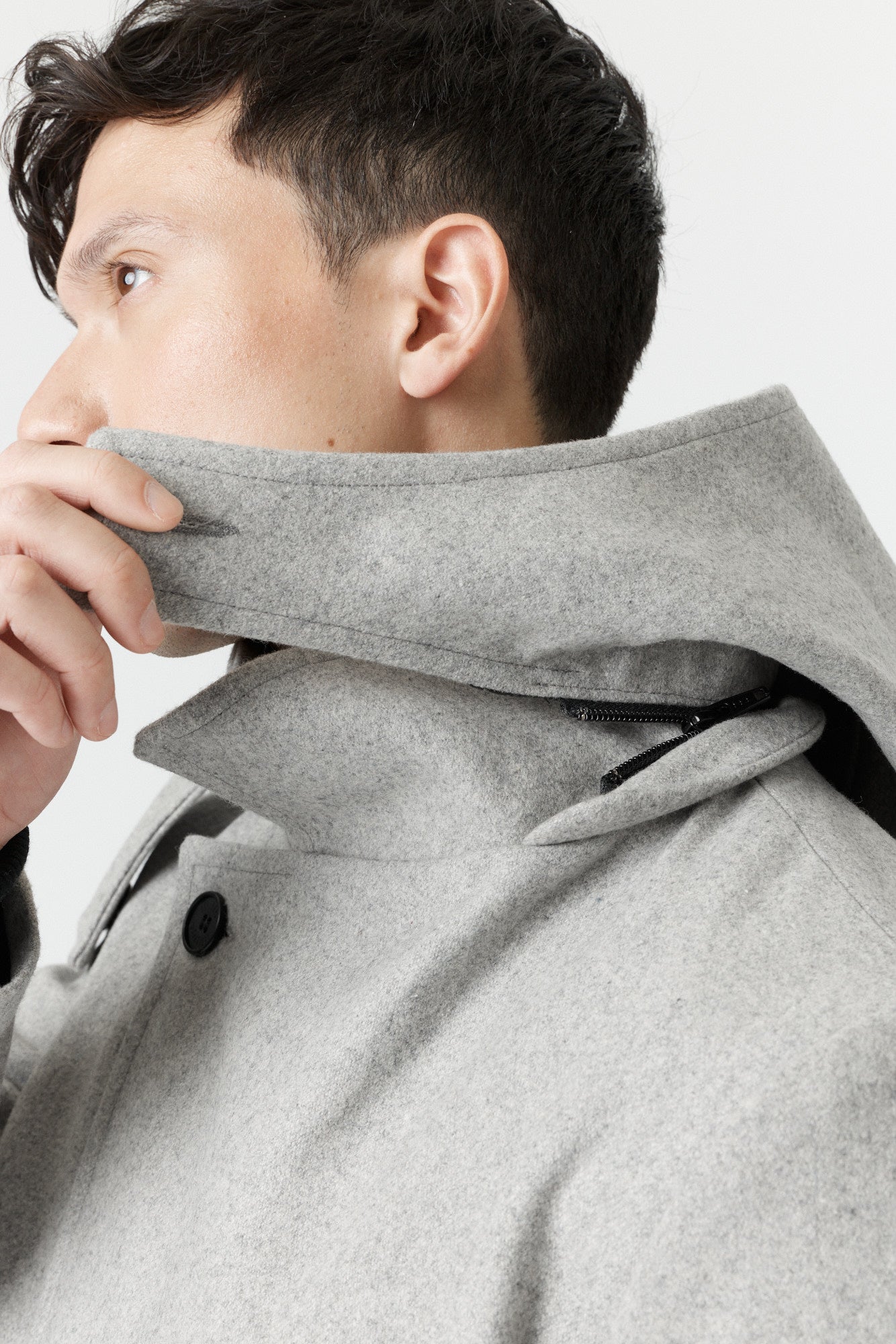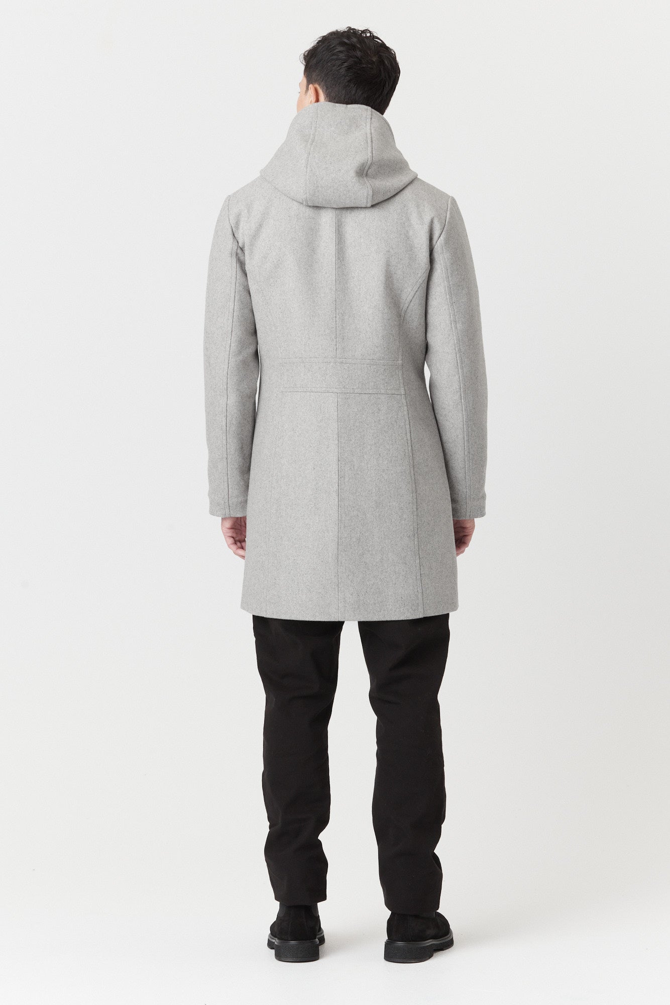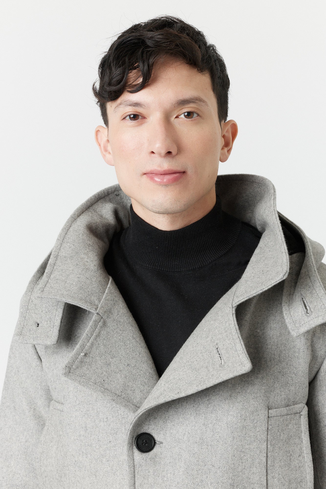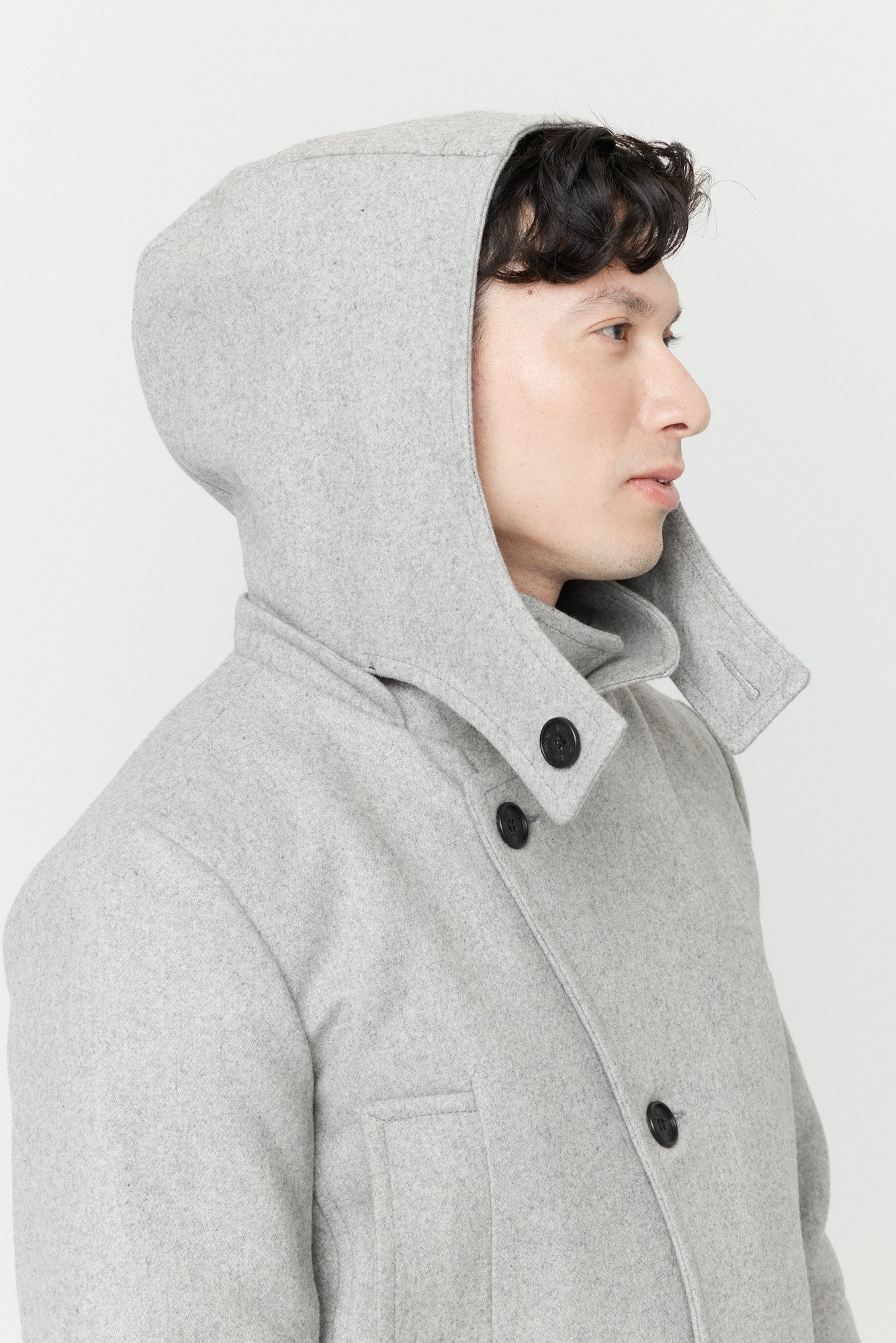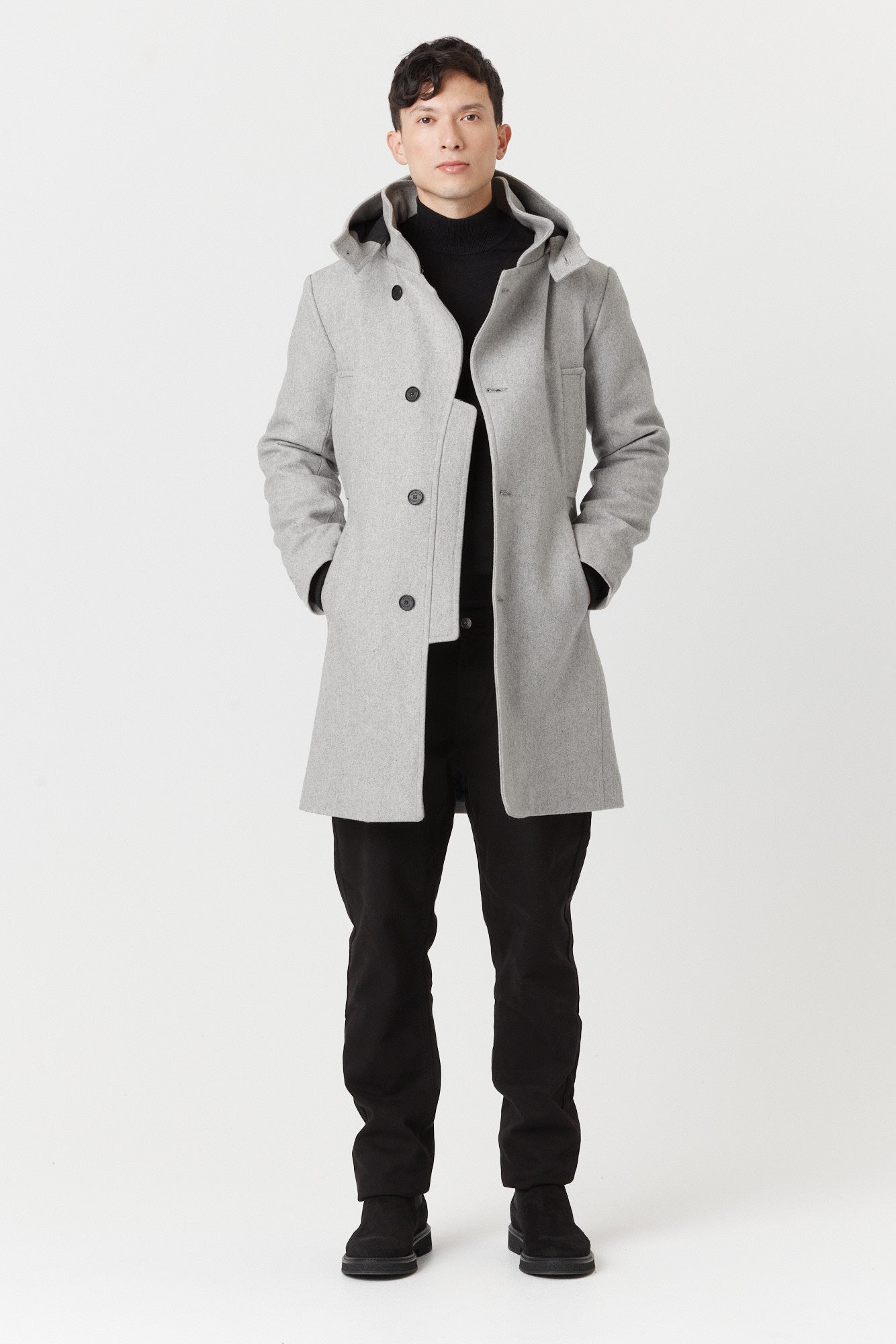 Long coat, fitted cut, urban made of virgin wool. Quilted lining, hand warmer pockets, interior pocket and detachable hood.