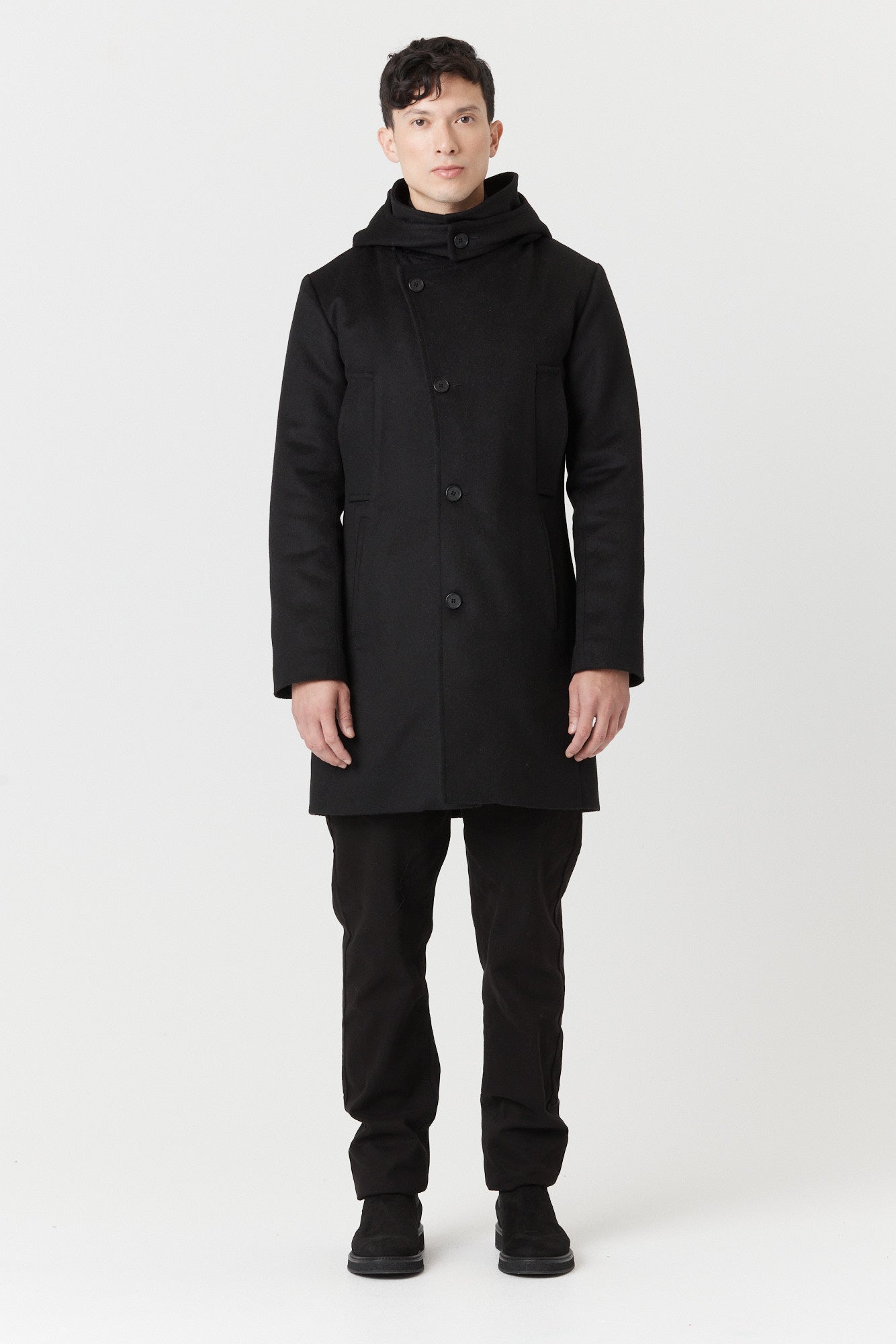 Desloups men's asymmetrical winter coat with detachable hood in 100% wool and lined