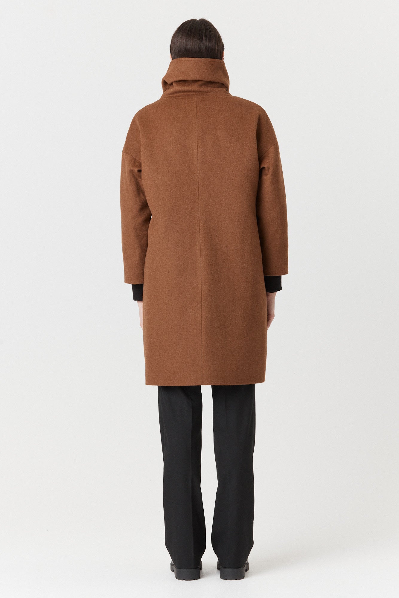 Ce modèle oversize, à coupe droite et double boutonnage, se distingue par son grand col asymétrique qui peut se refermer complètement pour une protection maximale. La doublure matelassée et les poches réchauffe-mains ajoutent un confort idéal pour l’hiver.
