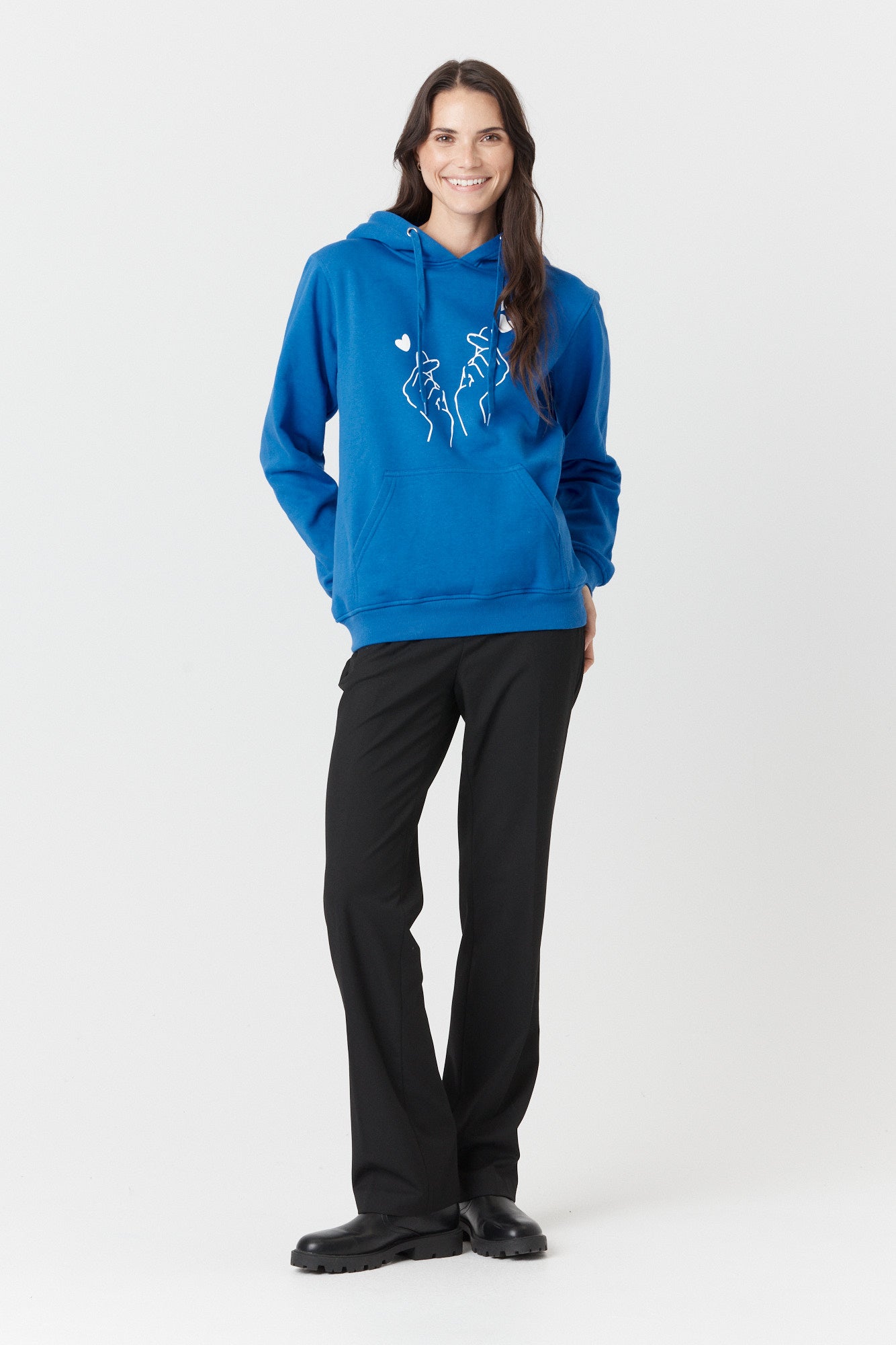 Chandail unisexe à capuchon et imprimé original créé par Desloups de couleur bleu royal. Imprimé au motif "J'aime" avec deux mains et coeurs.
