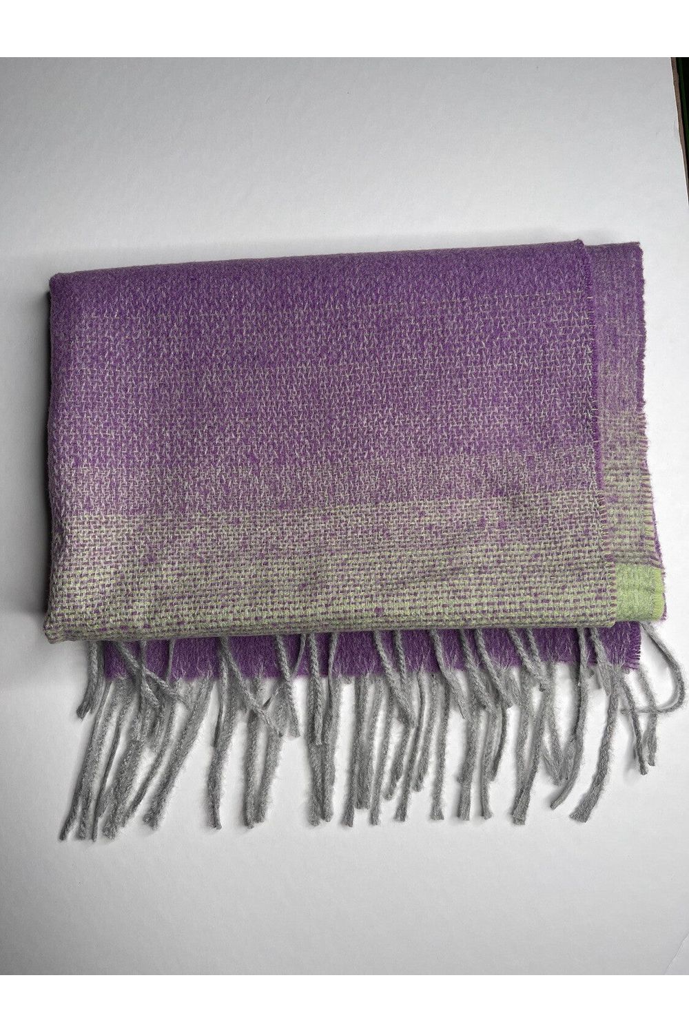 Grand foulard rectangulaire avec couleur dégradé mauve et vert. Très doux et confortable.